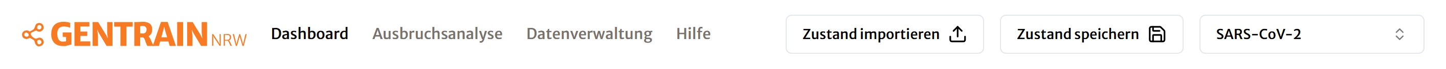Die Navigationsleiste ermöglicht Ihnen den schnellen Zugriff auf die verschiedenen Anwendungsbereiche von GENTRAIN sowie auf zentrale Funktionen wie das Speichern und Importieren der lokalen Datenbank (aktueller Zustand der Anwendung) oder den Wechsel des aktiven Pathogens.